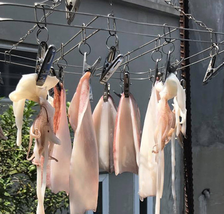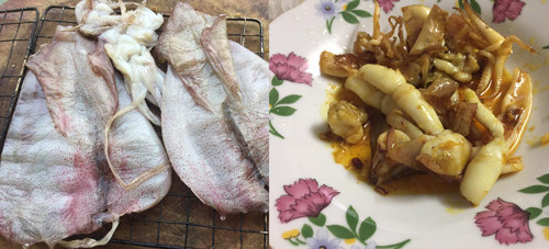 Chị cũng mang mực ra phơi để món mực chiên được thơm ngon hơn. Chị cho biết những công thức này học được ở trên mạng, ngày cuối tuần rảnh rỗi trời lại nắng to nên quyết định mang ra làm thử.