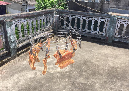 Chị Trang chia sẻ phơi thịt ngoài nắng giúp thịt săn có mùi thơm hơn, rán không bị bắn, không bị hút mỡ.