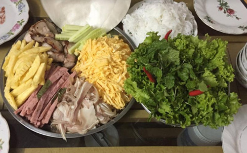 Lần đầu tiên thử làm món thịt ba chỉ phơi một nắng nhưng chị Trang đã rất thành công. Thịt thơm ngon, kèm với trứng rán, tai heo, bún... thành món cuộn dễ ăn trong ngày hè oi bức.