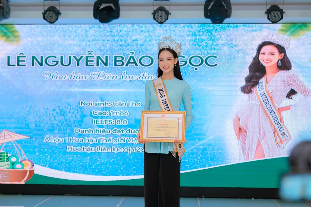 Hoa hậu Bảo Ngọc cũng ghi điểm nhờ sự chỉn chu trong trang phục khi đồng hành cùng sự kiện. Tại buổi họp báo công bố chương trình và ra mắt đại sứ, Bảo Ngọc lựa chọn diện chiếc áo bà ba của quê hương Nam Bộ.