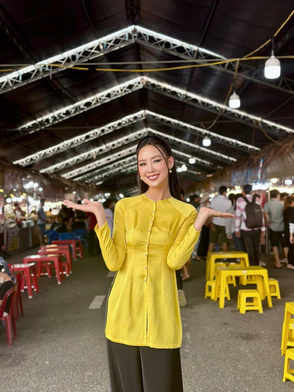 Khi đến tham quan và trải nghiệm các gian hàng cũng như các trò chơi dân gian, Bảo Ngọc tiếp tục xuất hiện với trang phục áo bà ba màu vàng nổi bật.