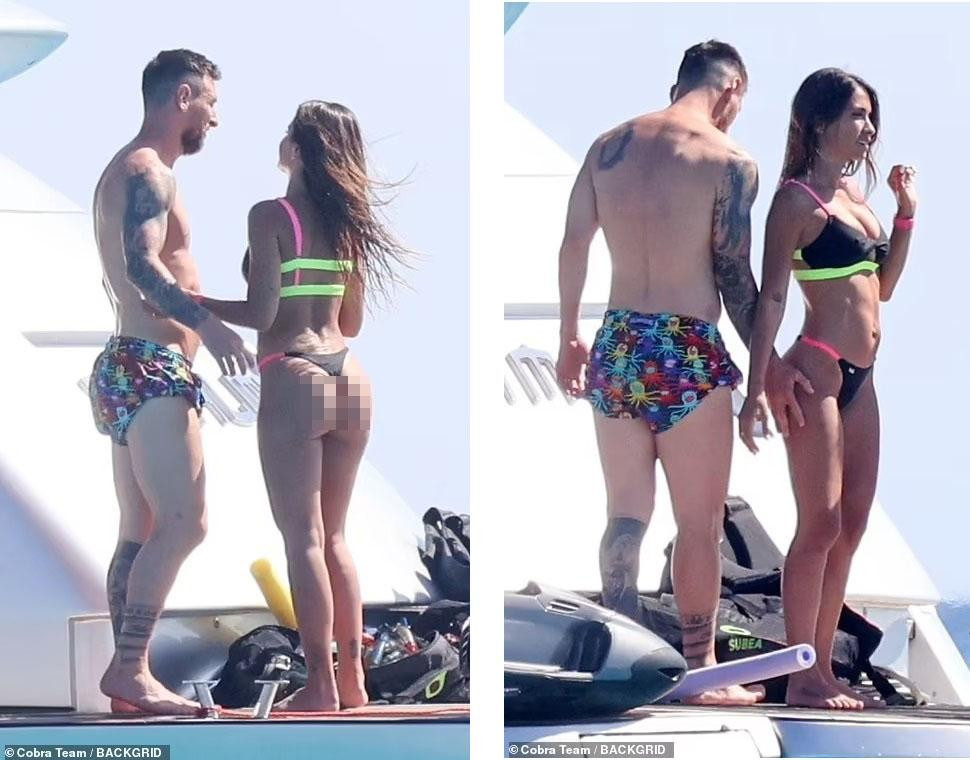 | Messi và bà xã Antonela Roccuzzo đều mặc đồ bơi nhiều màu sắc và "thiếu vải" khoe hình thể "cực phẩm". |