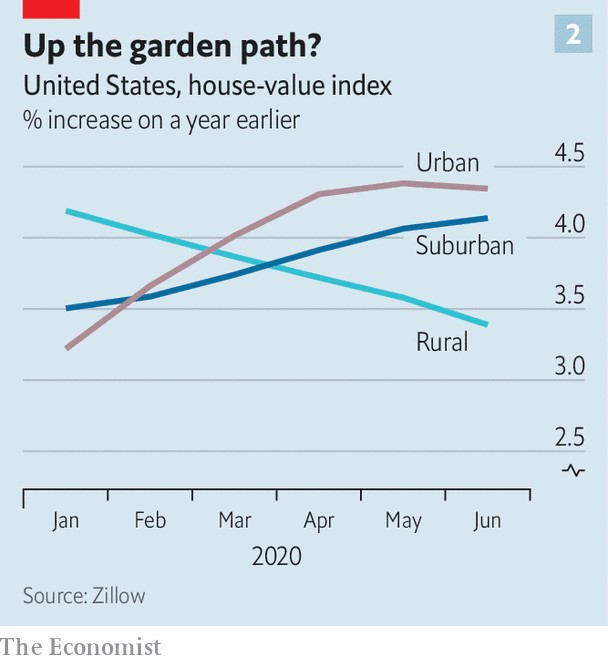 Mọi người dường như cũng đang tìm kiếm không gian rộng hơn. Mặc dù thị trường nhà ở New York và San Francisco có vẻ yếu, nhưng có rất ít bằng chứng để chứng minh cho việc mọi người đang rời bỏ các thành phố để đến vùng ngoại ô, đặc biệt là ở Mỹ. Theo dữ liệu từ Zillow - nền tảng bất động sản trực tuyến cho biết, giá bất động sản ở thành thị và ngoại ô đang tăng với tốc độ gần giống nhau. Tuy nhiên, giá ở nông thôn tăng trưởng chậm hơn (xem biểu đồ 2). Có vẻ như nhiều người đang tìm kiếm những ngôi nhà lớn hơn gần nơi họ đã sống. Ở Anh, giá nhà biệt lập đang tăng với tốc độ hàng năm là 4%, so với 0,9% đối với căn hộ. Thêm vào đó, thị trường nhà có sân vườn có phần sôi động hơn so với nhà không có vườn.