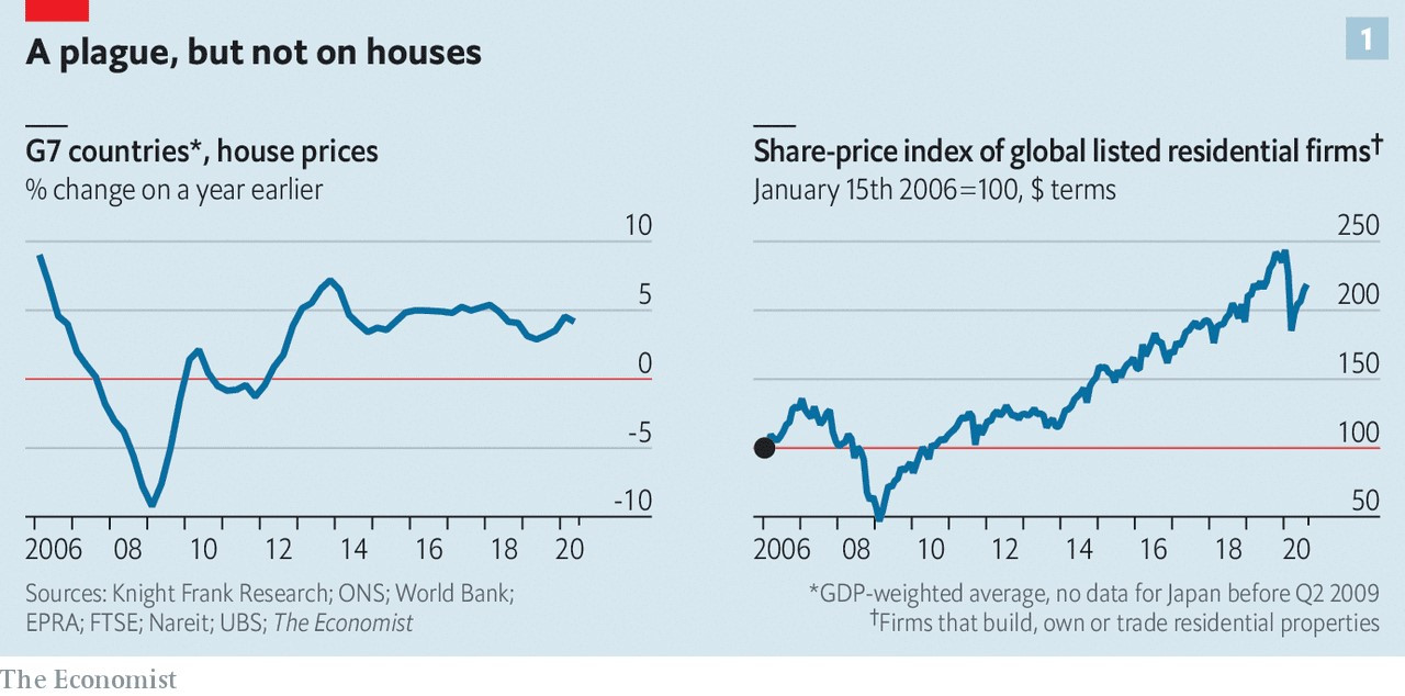 Thế nhưng lo ngại này đã không xảy ra trong kịch bản đại dịch của năm 2020. Giá nhà đất trong quý II/2020 đang theo trên chiều hướng tăng ở hầu hết các quốc gia có thu nhập trung bình và cao. Ở những quốc gia giàu có thuộc khối G7, giá bất động sản tại đây đã tăng với tốc độ hàng năm là 5% (xem biểu đồ 1). Giá cổ phiếu của các nhà đầu tư và nhà kinh doanh bất động sản đã giảm một phần tư trong giai đoạn đầu của đại dịch, nhưng hiện tại, phần lớn đã phục hồi.