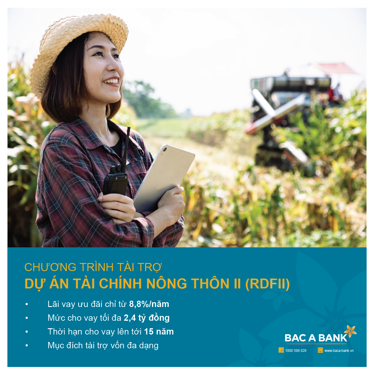 Chương trình tài trợ theo Dự án “Tài chính nông thôn II” tạo điều kiện tối đa cho các tiểu dự án phát triển nông nghiệp nông thôn với số tiền cho vay tối đa là 75% tổng chi phí dự án, hạn mức cho vay lên đến 2,4 tỷ đồng cho mỗi tiểu dự án. Lãi suất chỉ từ 8,8%/ năm cùng với chính sách linh hoạt về tài sản đảm bảo; các doanh nghiệp/ cá nhân tham gia vay vốn sẽ có nhiều ưu thế trong việc cân đối tài chính và dòng tiền. Với việc tài trợ cho các tiểu dự án đầu tư trung và dài hạn được đánh giá khả thi trên phạm vi toàn quốc (trừ khu vực nội thành của Tp. Hà Nội, Tp. HCM, Tp. Hải Phòng và Tp. Đà Nẵng) một lần nữa khẳng định nỗ lực không ngừng tối ưu hóa lợi ích khách hàng của BAC A BANK.