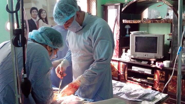 Các bác sỹ đã kê 2 chiếc bàn uống nước lại thành bàn mổ và tiến hành gây mê và phẫu thuật ngay tại nhà của bệnh nhân trong điều kiện thiếu rất nhiều phương tiện hỗ trợ cũng như điều kiện về ánh sáng, vô trùng…