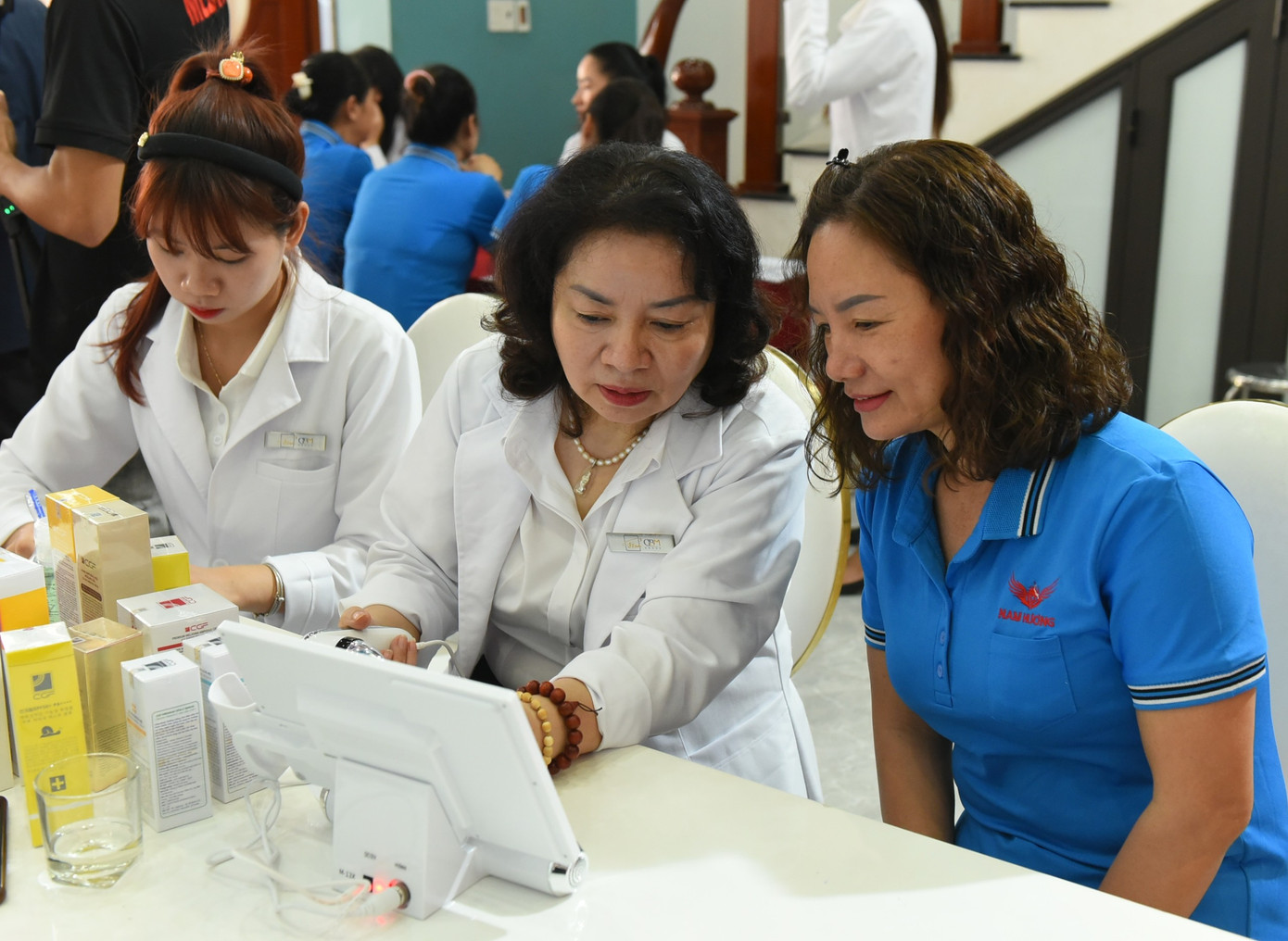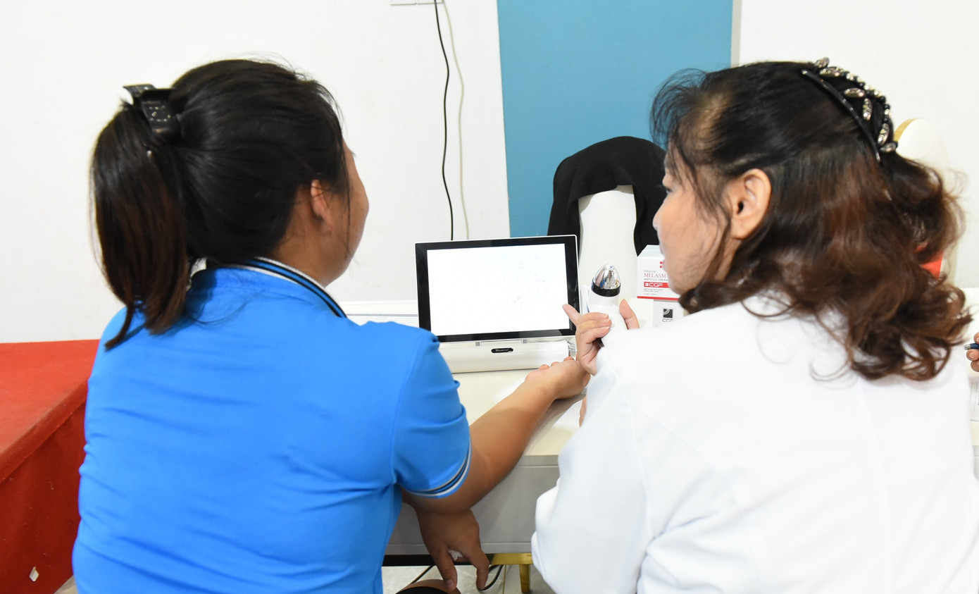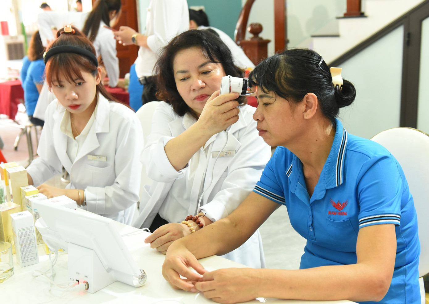 | Các chuyên gia soi da và tư vấn chăm sóc da cho các nữ công nhân xưởng may Nam Hương. |