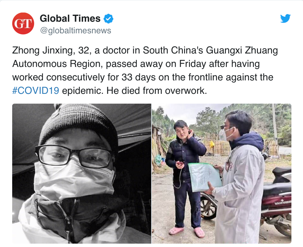 Cũng trong ngày 28/2, một bác sĩ khác có tên Zhong Jinxin (32 tuổi), ở Khu tự trị dân tộc Choang Quảng Tây, đã qua đời sau khi làm việc liên tục 33 ngày ở tuyến đầu chống dịch.