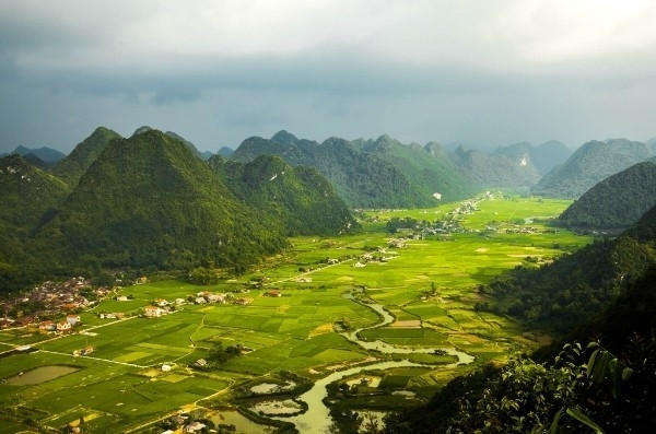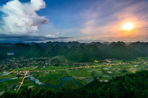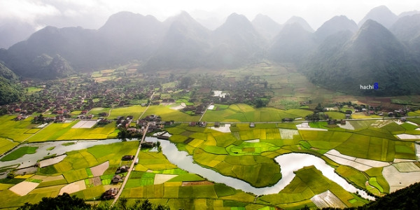 Nơi đẹp nhất để chiêm ngưỡng toàn cảnh thung lũng là trèo lên đỉnh núi Bắc Sơn. Mùa xanh của mạ non, màu vàng của lúa ken trong màu núi, màu mây tạo hơn khung cảnh rực rỡ. (Ảnh: Hachi8/Zing)