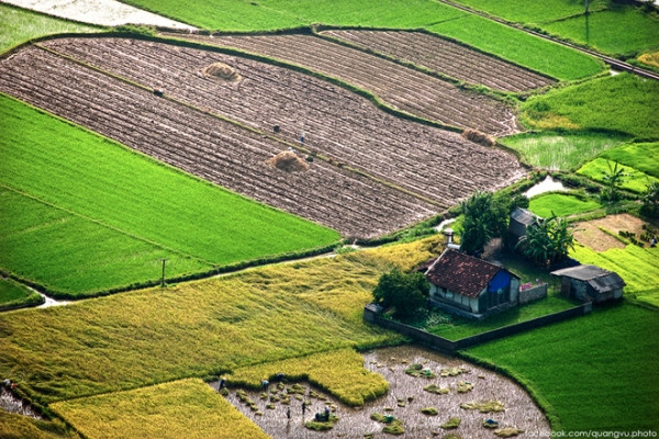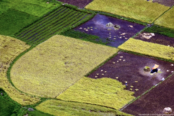 Chính điều này đã tạo nên những mảng đan xen kì thú trong bức tranh Bắc Sơn mùa lúa.Nhìn xa, những ruộng lúa non, lúa chín đối lập vui mắt như một tấm thổ cẩm cầu kỳ. (Ảnh: Quang Vũ/VnExpress)