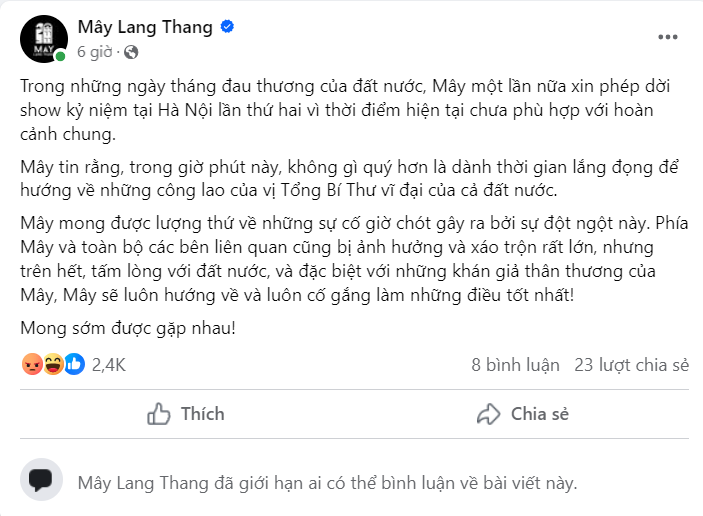 Trưa 27/7, sau khi nhận được công văn từ Sở Văn hóa và Thể thao Hà Nội về việc tạm dừng chương trình nghệ thuật vào tối 27/7, ban tổ chức chương trình Mây Lang Thang đã đăng một bài viết với mục đích “kêu cứu” khán giả. Tuy nhiên, nhiều cư dân mạng phẫn nộ trước cách xử lý của ban tổ chức vì công văn hỏa tốc đã được gửi từ ngày 26/7 nhưng ban tổ chức vẫn không chịu hoãn ngay mà vẫn cố tìm cách cứu vãn. Hiện tại, bài đăng này đã được xóa.