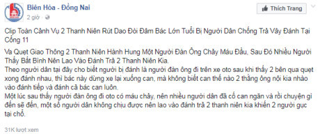 Theo Facbook Biên Hòa - Đồng Nai chia sẻ: "Va quệt giao thông 2 thanh niên hành hung một người đàn ông chảy máu đầu, sau đó nhiều người thấy bất bình nên lao vào đánh trả 2 thanh niên Kia.