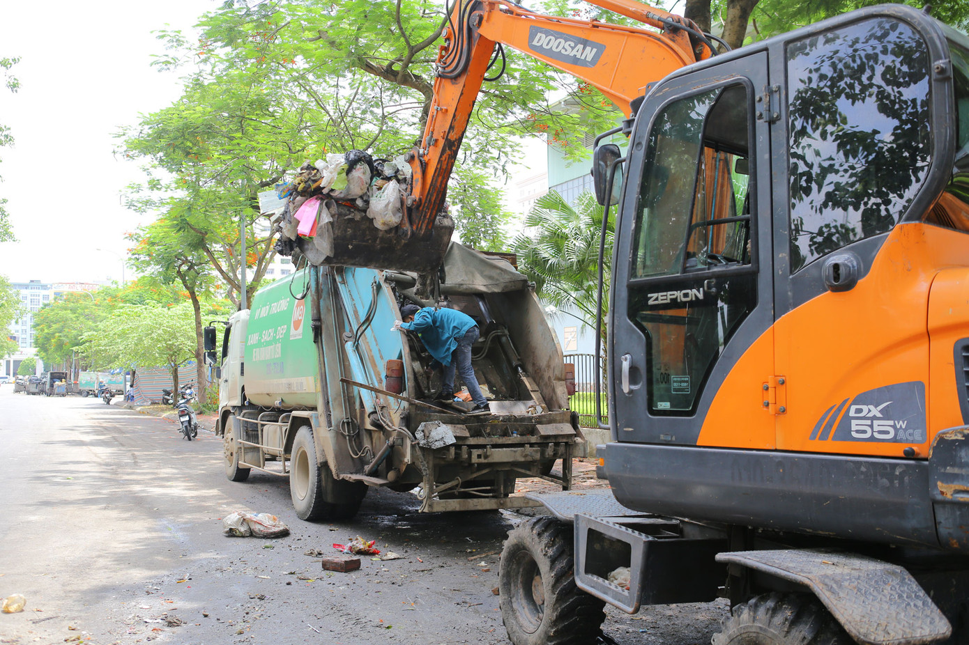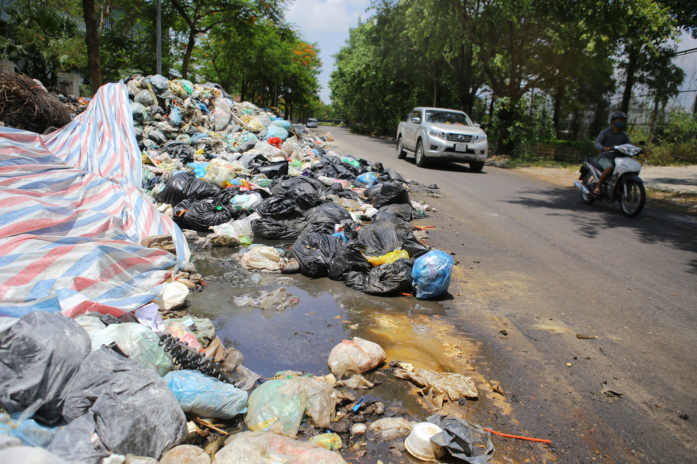 Một đại diện Công ty môi trường phụ trách địa bàn cho biết: “Từ ngày xe rác chạy trở lại, chúng tôi phải túc trực và làm việc thay ca nhau liên tục 24/24 ở đây nhưng vẫn không xuể. Vì rác cũ chất đống vẫn còn đó, mà rác mới vẫn đổ về đây liên tục hàng ngày. Rác tồn lại lâu nhiều ngày, cộng thêm thời tiết nắng nóng nên chúng tôi phải dùng bạt phủ kín lại và rắc vôi bột lên trên để hạn chế mùi hôi thối".