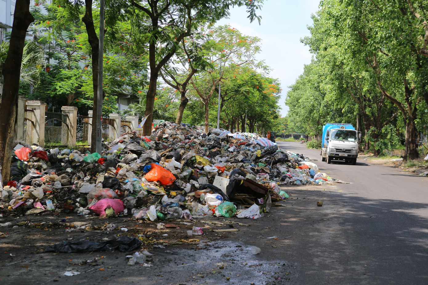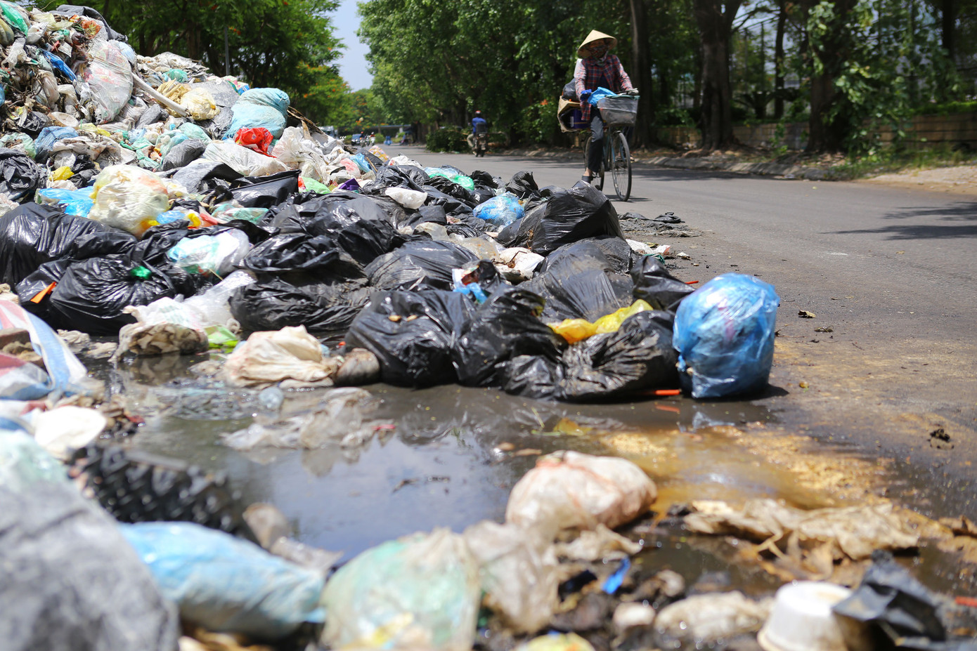 Rác chất thành từng đống, nối tiếp nhau chạy dọc theo hàng rào cung điền kinh, rác tràn ra đường gây khuất tầm nhìn, gây nguy cơ tiềm ẩn tai nạn cho người tham gia giao thông. Hầu hết, mọi người khi đi qua đây đều trong tình trang một tay lái xe, một tay bị mũi phóng thật nhanh để thoát khỏi mùi nồng nặc của rác thải.
