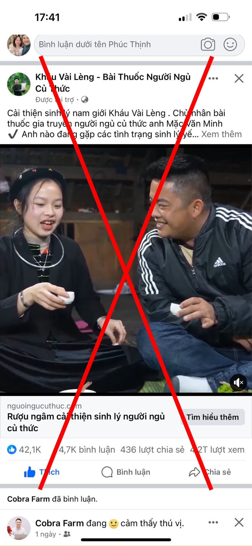 Ông Hoàng, 55 tuổi ở Hà Nội, người mua phải sản phẩm kháu vài lèng giả, tại một page giả mạo trên Facebook cho biết: “Tôi thấy page sử dụng hình ảnh ông Minh, có đầy đủ các video nói về bài thuốc, tin tưởng nên tôi đặt hàng về sử dụng. Về dùng một tuần tôi mới biết mình mua phải hàng không chính hãng, gọi lại số điện thoại trên page đó bị lăng mạ, chặn số liên lạc.