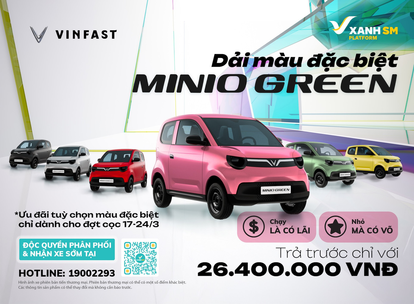 Minio Green là mẫu xe được đánh giá là “ngôi sao đường phố” với kích thước nhỏ gọn, dễ lái, dễ đỗ trong không gian nhỏ, nhưng vẫn chở được 4 người. Với mức giá dễ mua với đa số và các đặc quyền chỉ dành cho khách hàng cọc tiên phong (từ 17/3 – 24/3 độc quyền qua kênh phân phối của GSM), Minio Green đang khiến cho cả người dùng cá nhân và cộng đồng chạy xe dịch vụ lên cơn sốt chưa từng thấy.