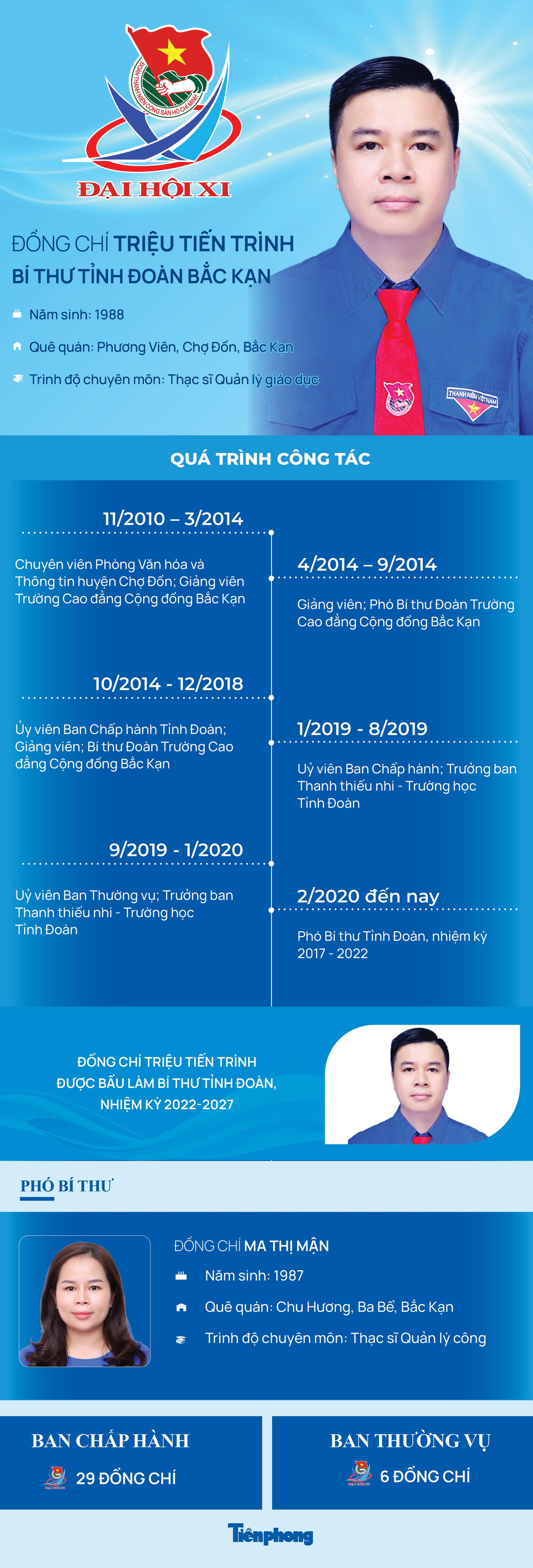 TPO - Ngày 12/10, Đại hội đại biểu Đoàn TNCS Hồ Chí Minh tỉnh Bắc Kạn lần thứ XI, nhiệm kỳ 2022-2027 bầu Ban Chấp hành Tỉnh Đoàn khóa XI gồm 29 đồng chí. Anh Triệu Tiến Trình, Phó Bí thư Tỉnh Đoàn Bắc Kạn khóa X, được bầu làm Bí thư Tỉnh Đoàn Bắc Kạn khóa XI, nhiệm kỳ 2022 – 2027. Chị Ma Thị Mận, Phó Bí thư Tỉnh Đoàn Bắc Kạn khóa X tiếp tục được bầu làm Phó Bí thư Tỉnh Đoàn khóa XI, nhiệm kỳ 2022 - 2027.