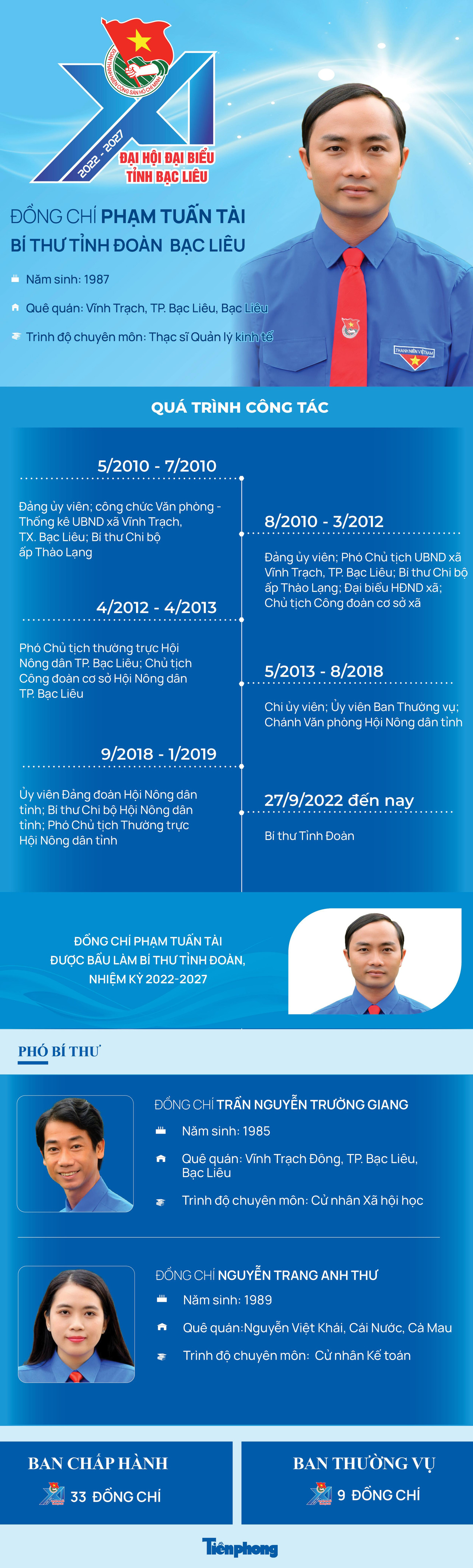 TPO - Đại hội đại biểu Đoàn TNCS Hồ Chí Minh tỉnh Bạc Liêu lần thứ XI, nhiệm kỳ 2022 – 2027, công bố Ban Chấp hành gồm 33 anh, chị. Anh Phạm Tuấn Tài, Bí thư Tỉnh Đoàn khóa X, nhiệm kỳ 2017 - 2022, được bầu làm Bí thư Tỉnh Đoàn khóa XI, nhiệm kỳ 2022 – 2027. Các Phó Bí thư Tỉnh Đoàn khóa XI là anh Trần Nguyễn Trường Giang và chị Nguyễn Trang Anh Thư.