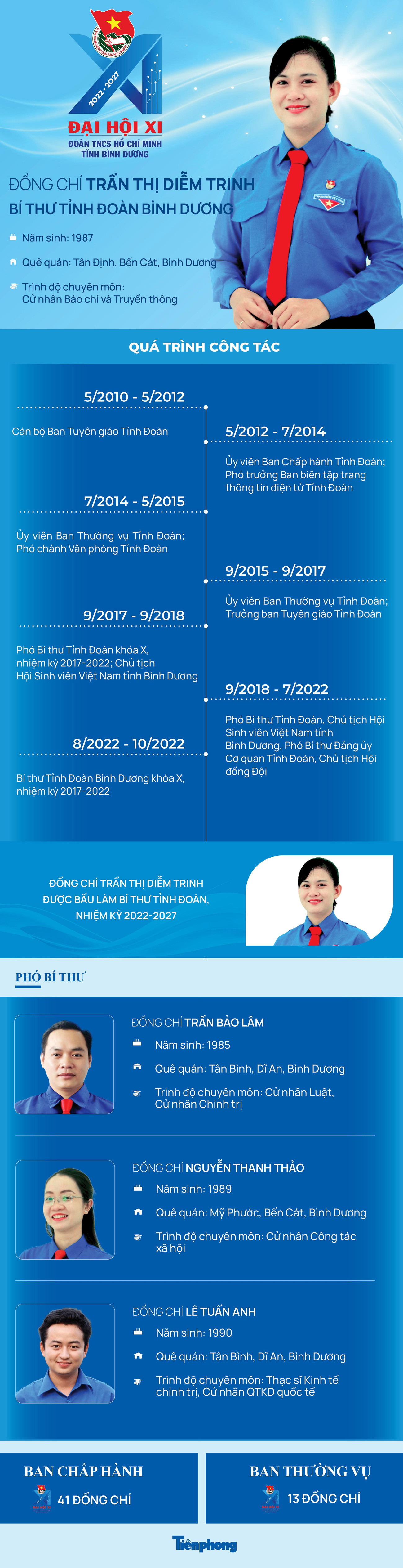 TPO - Đại hội Đại biểu Đoàn TNCS Hồ Chí Minh tỉnh Bình Dương khóa XI, nhiệm kỳ 2022-2027 đã tín nhiệm, bầu chị Trần Thị Diễm Trinh – Bí thư Tỉnh Đoàn Bình Dương khóa X, nhiệm kỳ 2017-2022 làm Bí thư Tỉnh Đoàn Bình Dương khóa XI, nhiệm kỳ 2022-2027. Đại hội đã bầu ba Phó Bí thư Tỉnh Đoàn Bình Dương khóa XI gồm: anh Trần Bảo Lâm, anh Lê Tuấn Anh và chị Nguyễn Thanh Thảo.