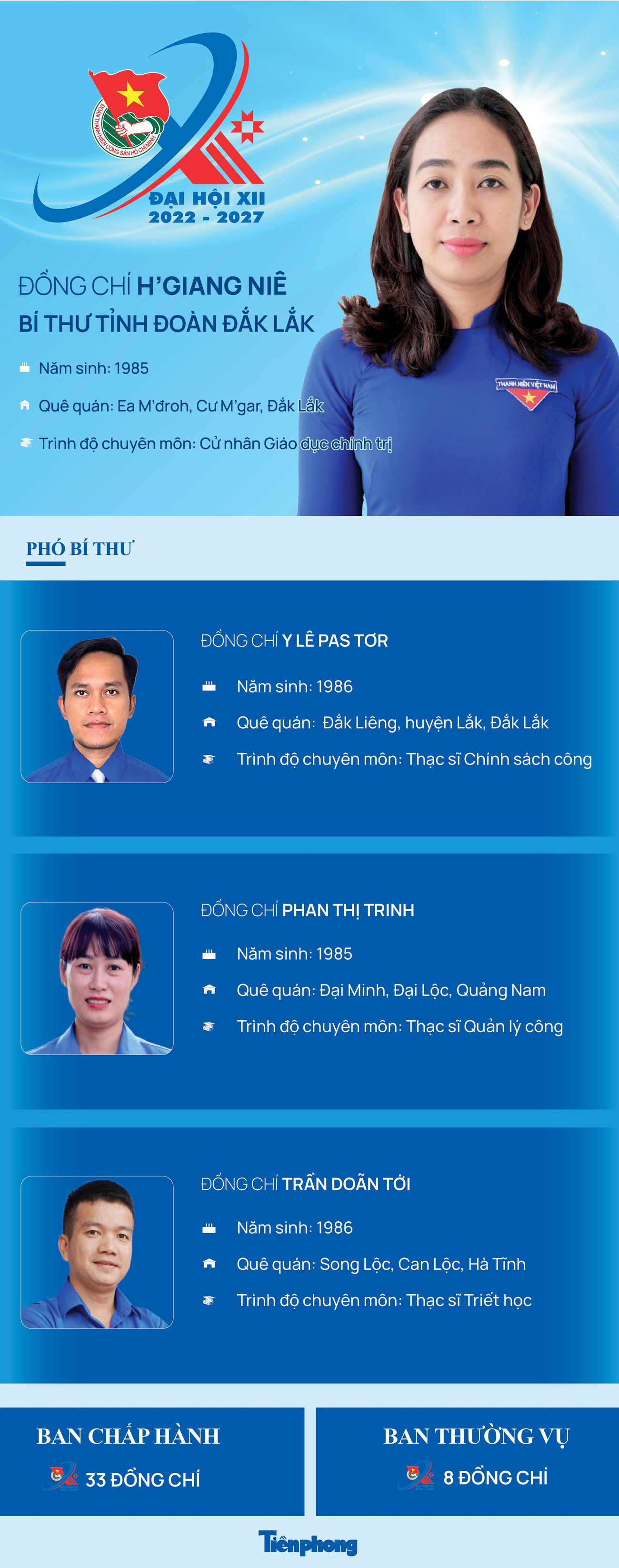 TPO - Chị H’Giang Niê, Bí thư Tỉnh Đoàn Đắk Lắk khóa XI được tín nhiệm bầu tái đắc cử Bí thư Tỉnh Đoàn Đắk Lắk khóa XII, nhiệm kỳ 2022 – 2027. Ba Phó Bí thư Tỉnh Đoàn khóa XII gồm anh Y Lê Pas Tơr, anh Trần Doãn Tới và chị Phan Thị Trinh.