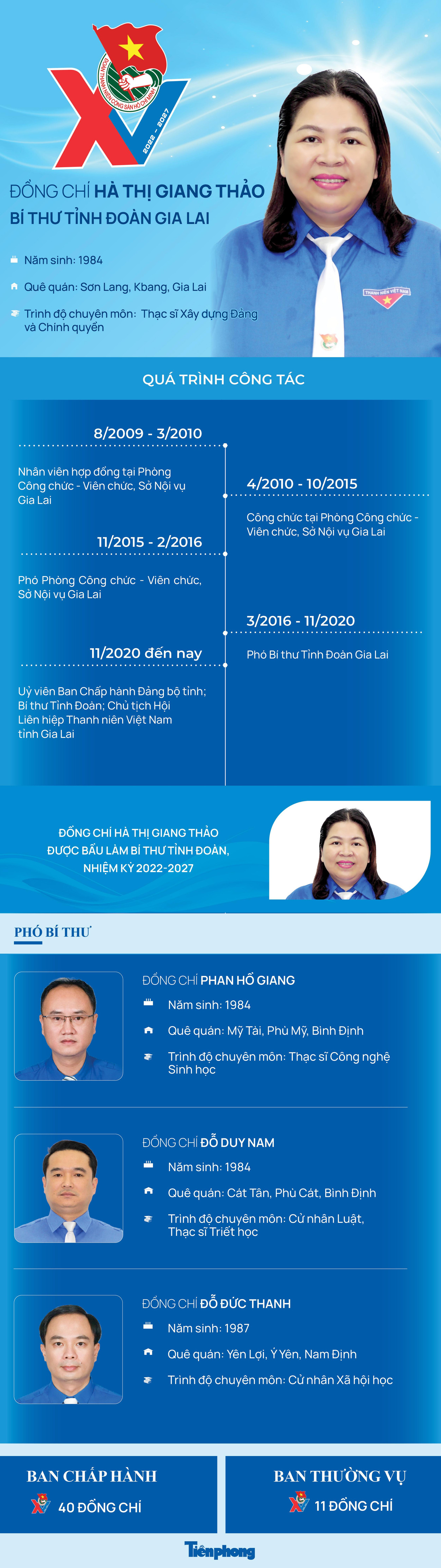 TPO - Đại hội đại biểu Đoàn TNCS Hồ Chí Minh tỉnh Gia Lai lần thứ XV, nhiệm kỳ 2022–2027 đã bầu 40 anh, chị vào Ban Chấp hành Tỉnh Đoàn khóa XV, nhiệm kỳ 2022 - 2027. Chị Hà Thị Giang Thảo - Bí thư Tỉnh Đoàn khoá XIV, nhiệm kỳ 2017-2022, tái đắc cử Bí thư Tỉnh Đoàn Gia Lai khóa mới. Các anh Phan Hồ Giang, Đỗ Duy Nam và Đỗ Đức Thanh tái đắc cử Phó Bí thư Tỉnh Đoàn Gia Lai khóa XV, nhiệm kỳ 2022-2027.