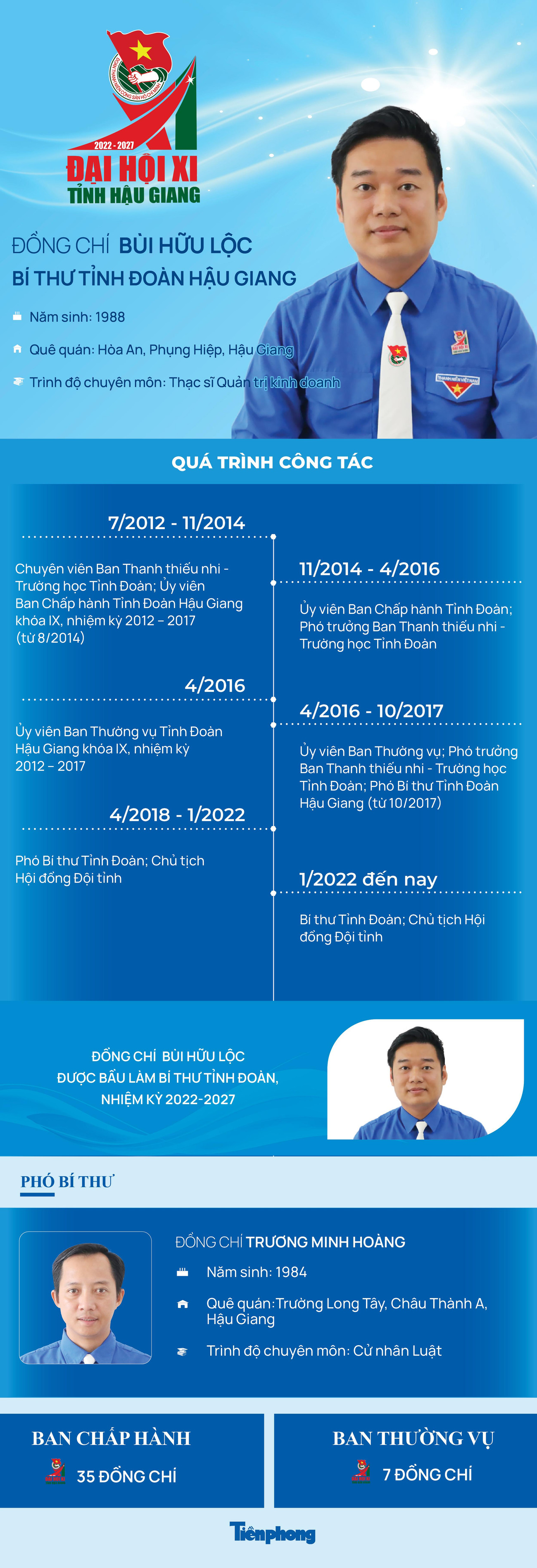TPO - Đại hội đại biểu Đoàn TNCS Hồ Chí Minh tỉnh Hậu Giang lần thứ XI, nhiệm kỳ 2022 – 2027 công bố Ban Chấp hành gồm 35 anh, chị. Anh Bùi Hữu Lộc - Bí thư Tỉnh Đoàn Hậu Giang khóa X, nhiệm kỳ 2017 - 2022, được bầu làm Bí thư Tỉnh Đoàn khóa XI, nhiệm kỳ 2022 – 2027. Anh Trương Minh Hoàng, Phó Bí thư Tỉnh Đoàn khóa X được bầu làm Phó Bí thư khóa XI.