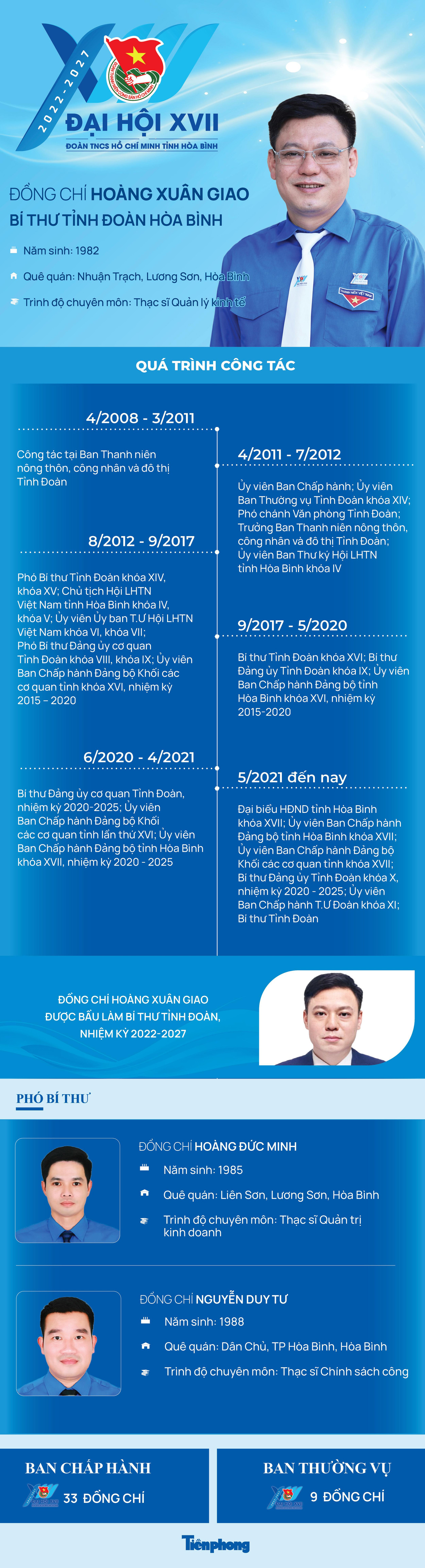 TPO - Đại hội đại biểu Đoàn TNCS Hồ Chí Minh tỉnh Hòa Bình khóa XVII, nhiệm kỳ 2022 – 2027 bầu Ban Chấp hành khóa mới gồm 33 anh, chị. Anh Hoàng Xuân Giao, Bí thư Tỉnh Đoàn Hòa Bình khóa XVI được tín nhiệm bầu tái đắc cử Bí thư Tỉnh Đoàn Hòa Bình khóa XVII, nhiệm kỳ 2022 – 2027. Hai Phó Bí thư Tỉnh Đoàn Hòa Bình khóa XVII là anh Hoàng Đức Minh và anh Nguyễn Duy Tư.