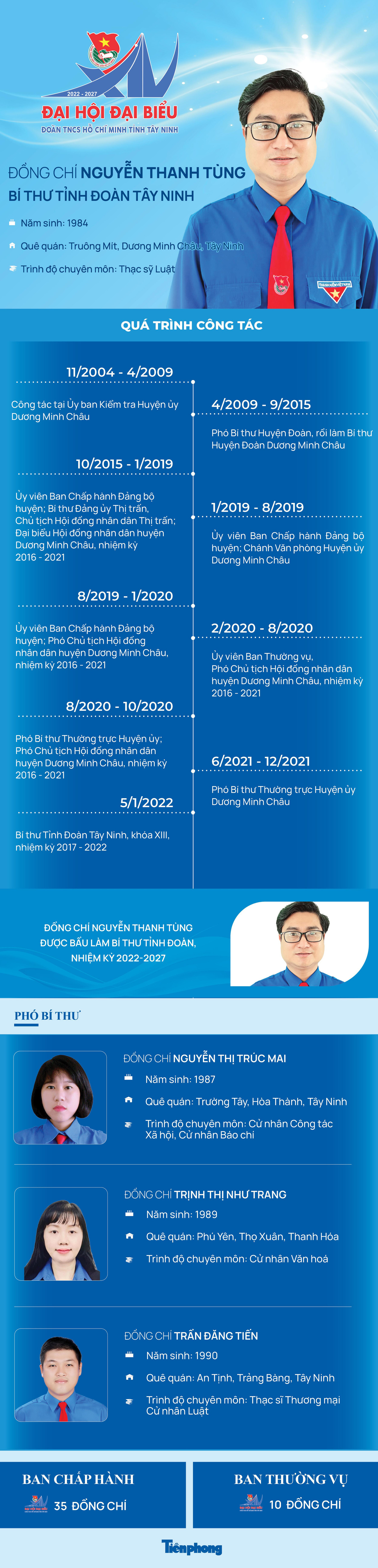 TPO - Đại hội Đoàn TNCS Hồ Chí Minh tỉnh Tây Ninh bầu Ban Chấp hành Đoàn TNCS Hồ Chí Minh tỉnh Tây Ninh khóa thứ XIV gồm 35 anh chị. Anh Nguyễn Thanh Tùng – Bí thư Tỉnh Đoàn Tây Ninh khóa XIII được bầu làm Bí thư Tỉnh Đoàn Tây Ninh khóa XIV. Ba Phó Bí thư là chị Nguyễn Thị Trúc Mai, chị Trịnh Thị Như Trang và anh Trần Đăng Tiến.