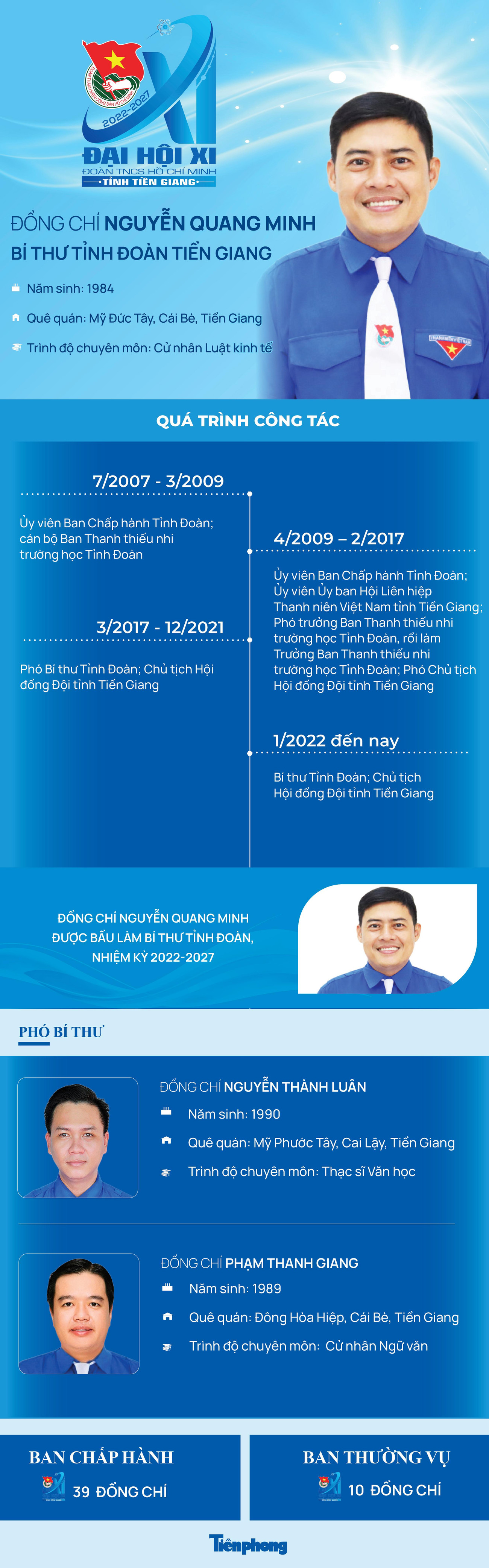 TPO - Đại hội đại biểu Đoàn TNCS Hồ Chí Minh tỉnh Tiền Giang lần thứ XI, nhiệm kỳ 2022 – 2027 công bố Ban Chấp hành gồm 39 anh, chị. Anh Nguyễn Quang Minh được bầu làm Bí thư Tỉnh Đoàn khóa XI, nhiệm kỳ 2022 – 2027. Hai Phó Bí thư Tỉnh Đoàn là anh Nguyễn Thành Luân và anh Phạm Thanh Giang.