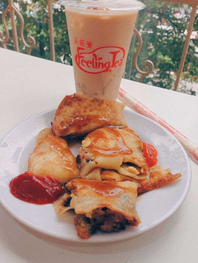 Menu đồ ăn của Feeling Tea có bánh hamburger, bánh sandwich với các loại nhân như thịt muối, thịt đùi, thịt sườn, thịt bò nhưng có lẽ được yêu thích nhất đó là bánh trứng. Bánh có phần vỏ khá giống với bánh crepe, bao trong đó là trứng rán, ngô, thịt bò/ thịt muối/ thịt đùi, ăn kèm với tương, sốt cà chua và sốt tương ớt.