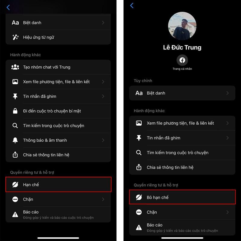 Bước 1: Truy cập vào ứng dụng Messenger > Kích chọn vào tin nhắn của người bạn muốn tắt hoạt động > Chọn vào avatar của người đó > Vuốt xuống dưới chọn Hạn chế.