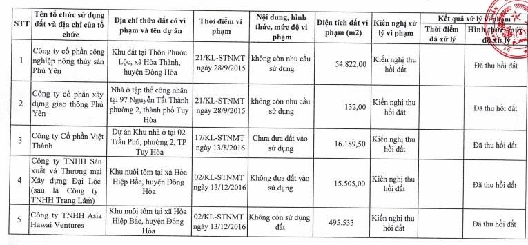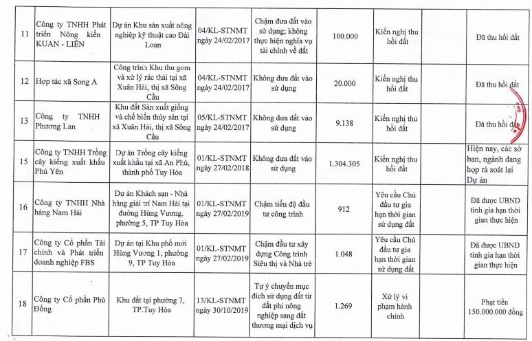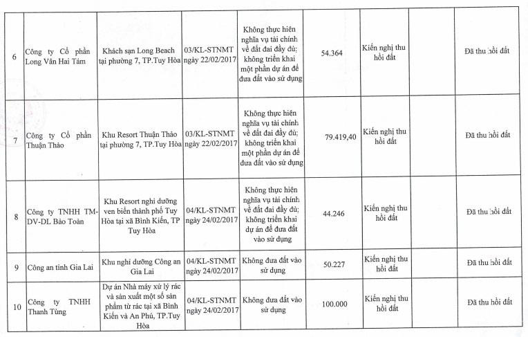 Dự án Khu nuôi tôm tại xã Hòa Hiệp Bắc, huyện Đông Hòa của Công ty TNHH Asia Hawai Ventures có diện tích hơn 495 nghìn m2; Dự án Nhà máy xử lý rác và sản xuất một số sản phẩm từ rác tại xã Bình Kiến và An Phú, TP.Tuy Hòa của Công ty TNHH Thanh Tùng với diện tích 100.000 m2; Dự án khu resort Thuận Thảo tại TP Tuy Hòa của Công ty CP Thuận Thảo có diện tích hơn 79.000 m2… Các dự án này đã bị thu hồi đất…