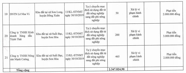 Theo đó, qua rà soát kết quả thanh tra, kiểm tra, xử lý vi phạm về sử dụng đất từ năm 2014 đến nay, tỉnh Phú Yên có 21 dự án, công trình vi phạm với tổng diện tích hơn 2.347.800 m2.