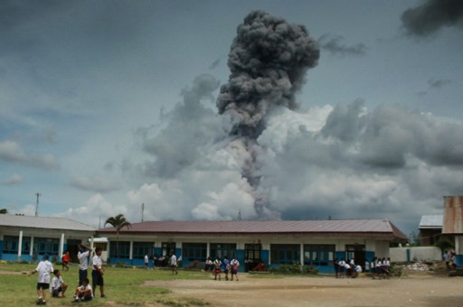 Bức ảnh chụp tại Karo, Nort Sumatra hôm 11/4 cho thấy học sinh Indonesia vẫn hồn nhiên chơi trên sân trường, phía sau là ngọn núi lửa Sinabung phun tro bụi khắp trời.