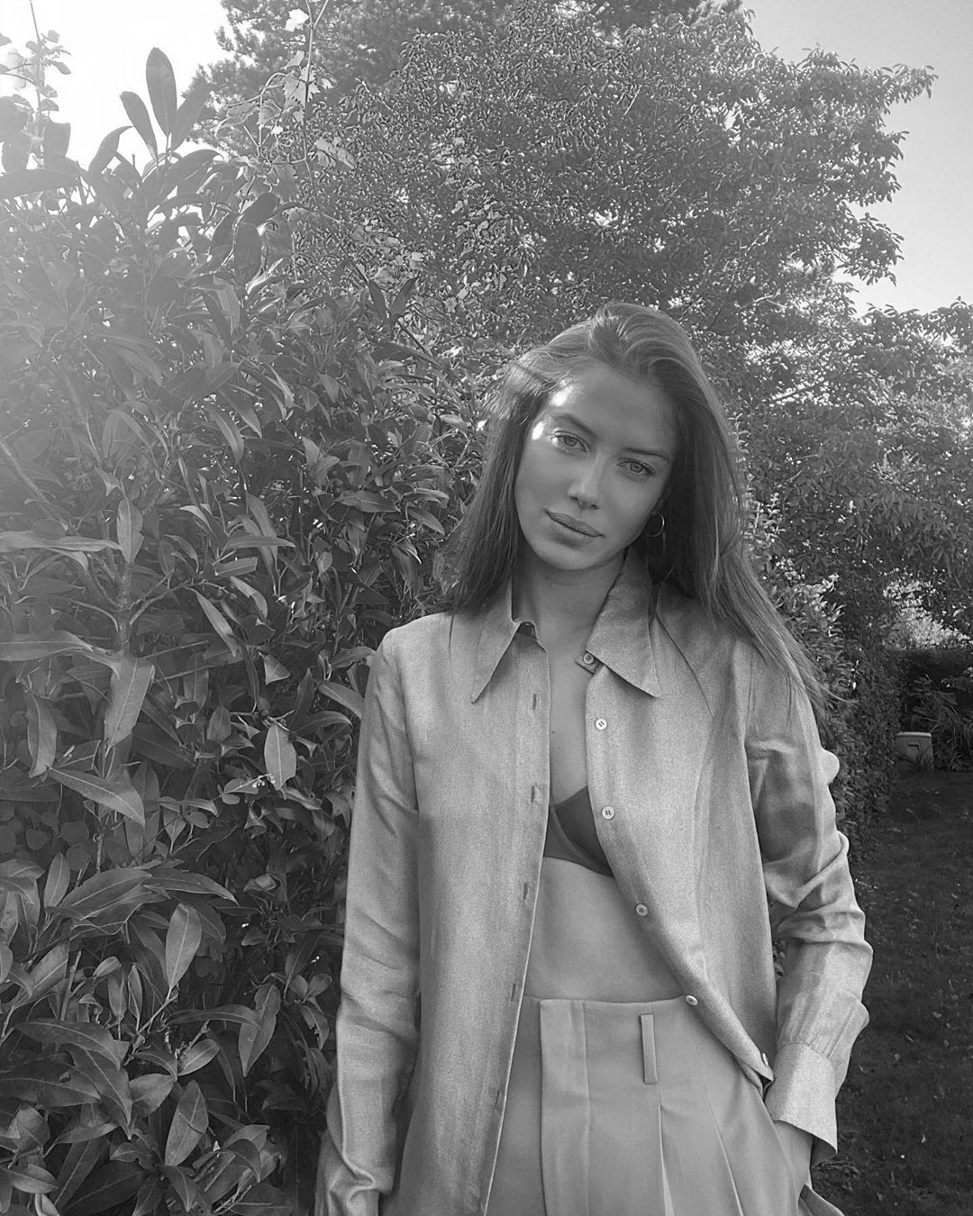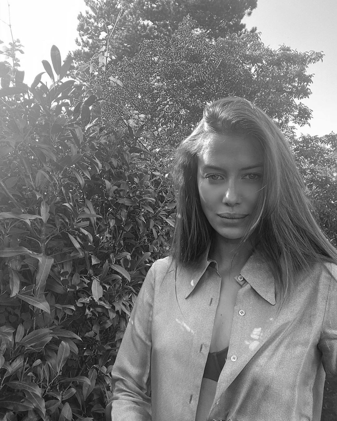 Trên trang cá nhân, bạn gái tài tử Brad Pitt đăng ảnh đen trắng diện sơ mi lấp ló nội y gợi cảm.