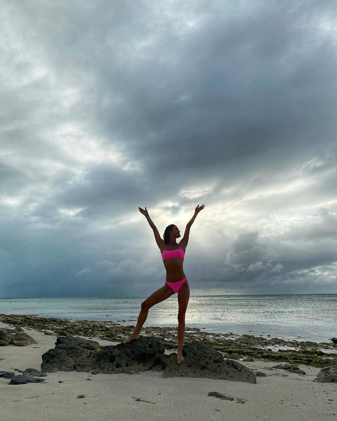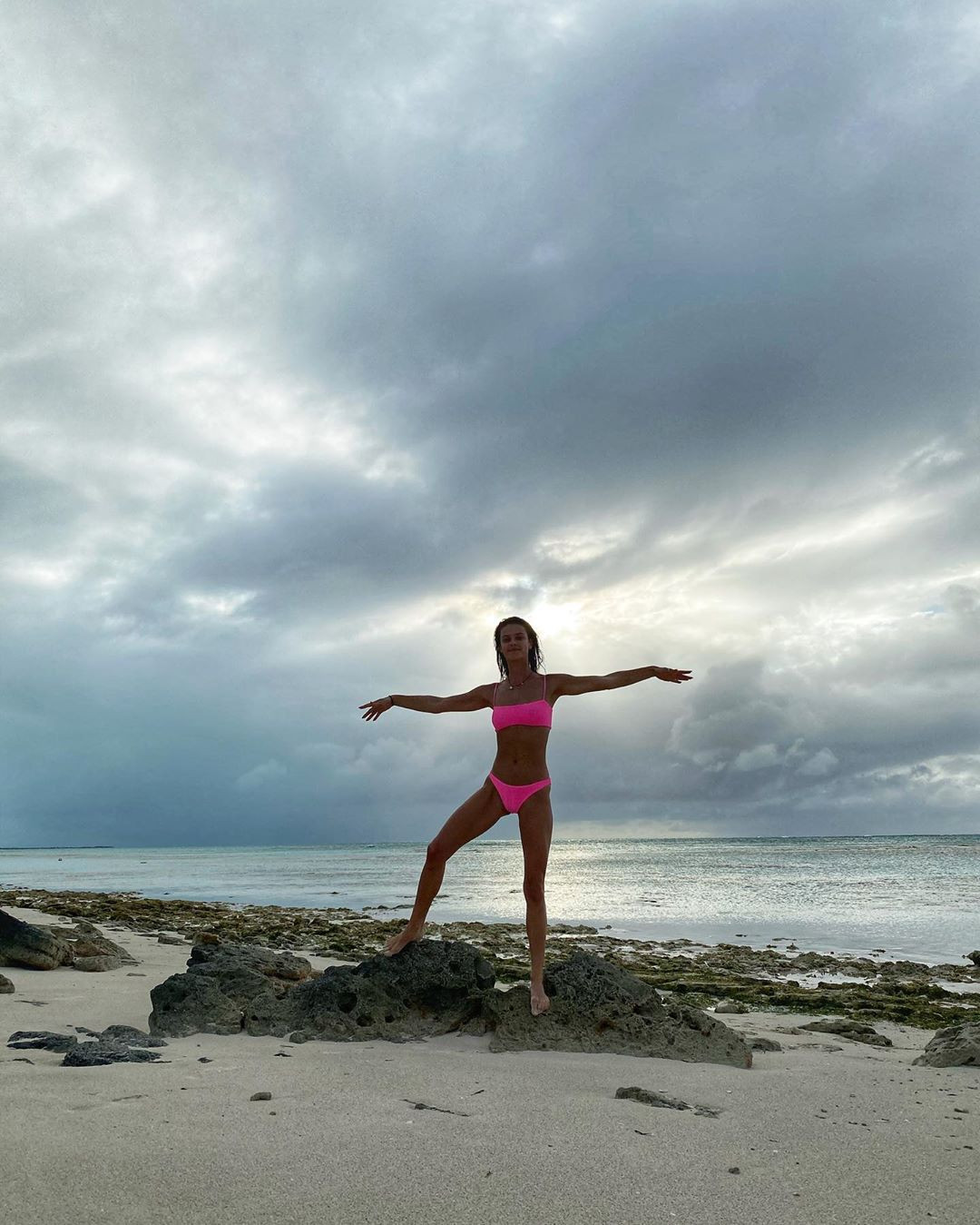 Nàng mẫu mặc bikini hồng, tạo dáng gợi cảm khoe hình thể tuyệt đẹp trước biển.