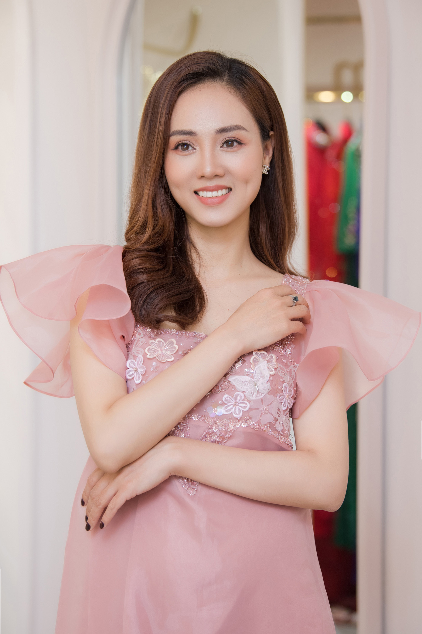 Người đẹp diện bộ váy gam màu hồng pastel kín đáo, thanh lịch nhưng vẫn đầy cuốn hút.