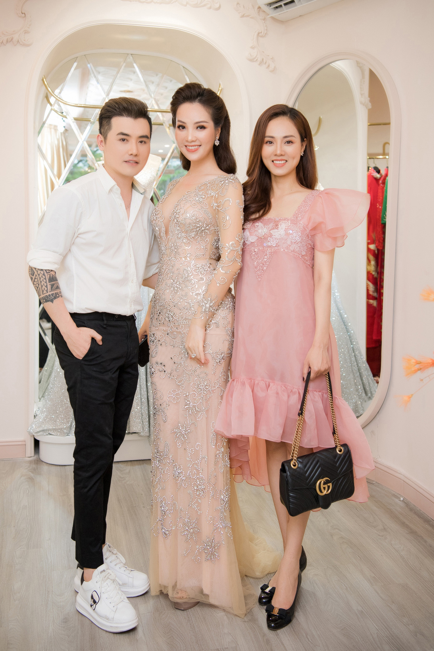 Ngọc Hà hội ngộ Á hậu Thuỵ Vân và chuyên gia trang điểm John Kim tại sự kiện.