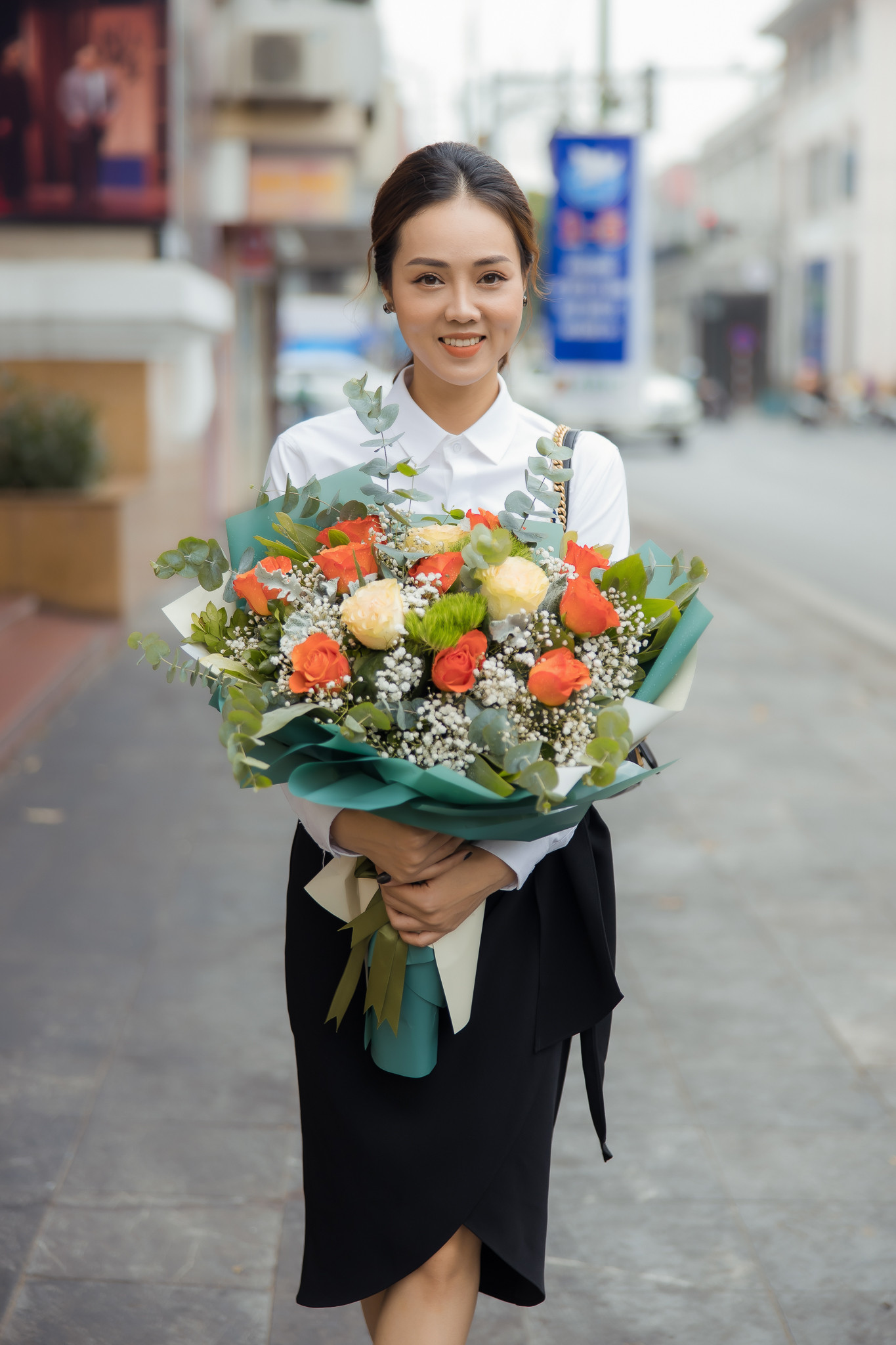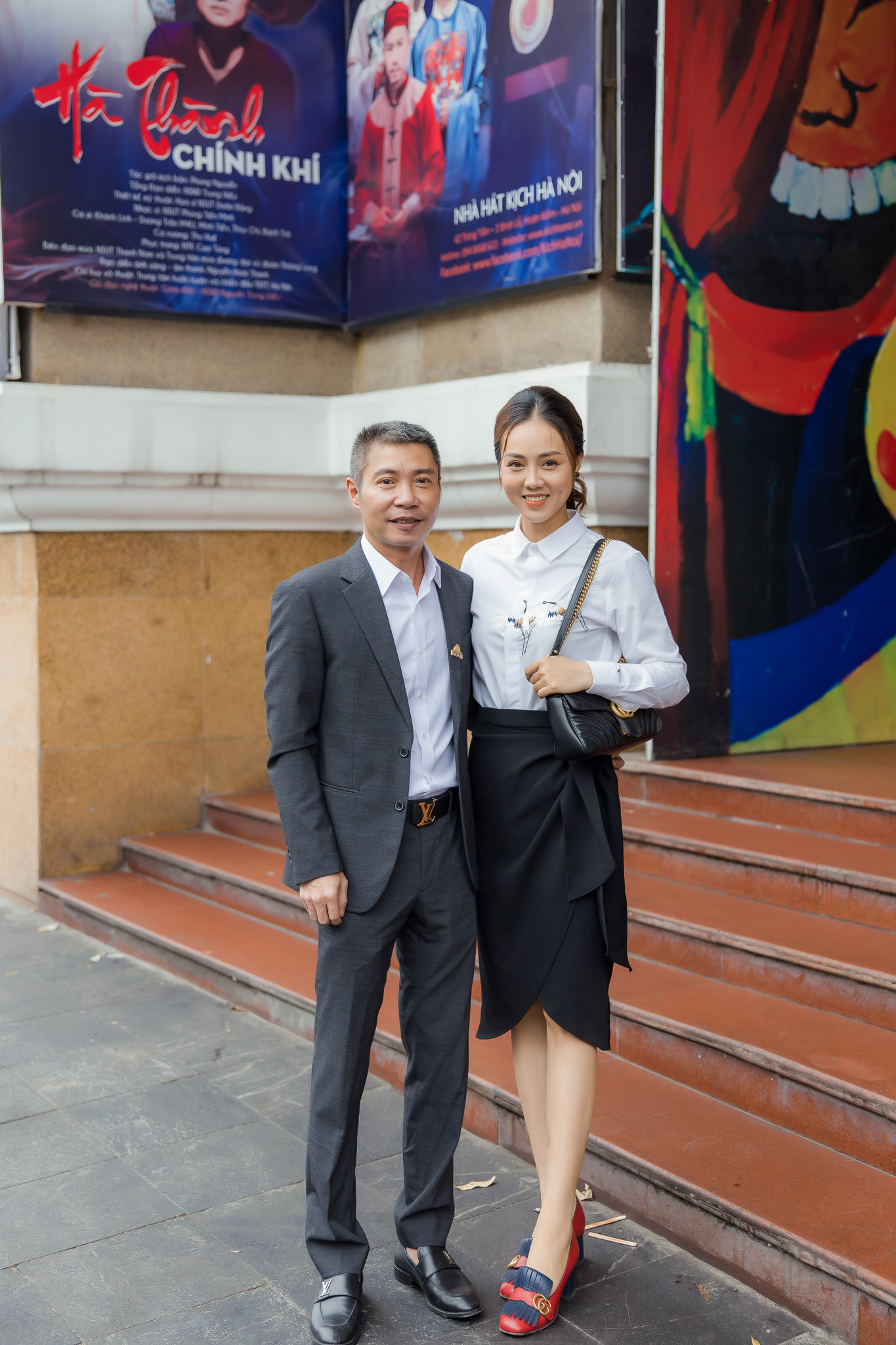 Cô mang theo một bó hoa rực rỡ để chúc mừng NSND Công Lý lên chức.