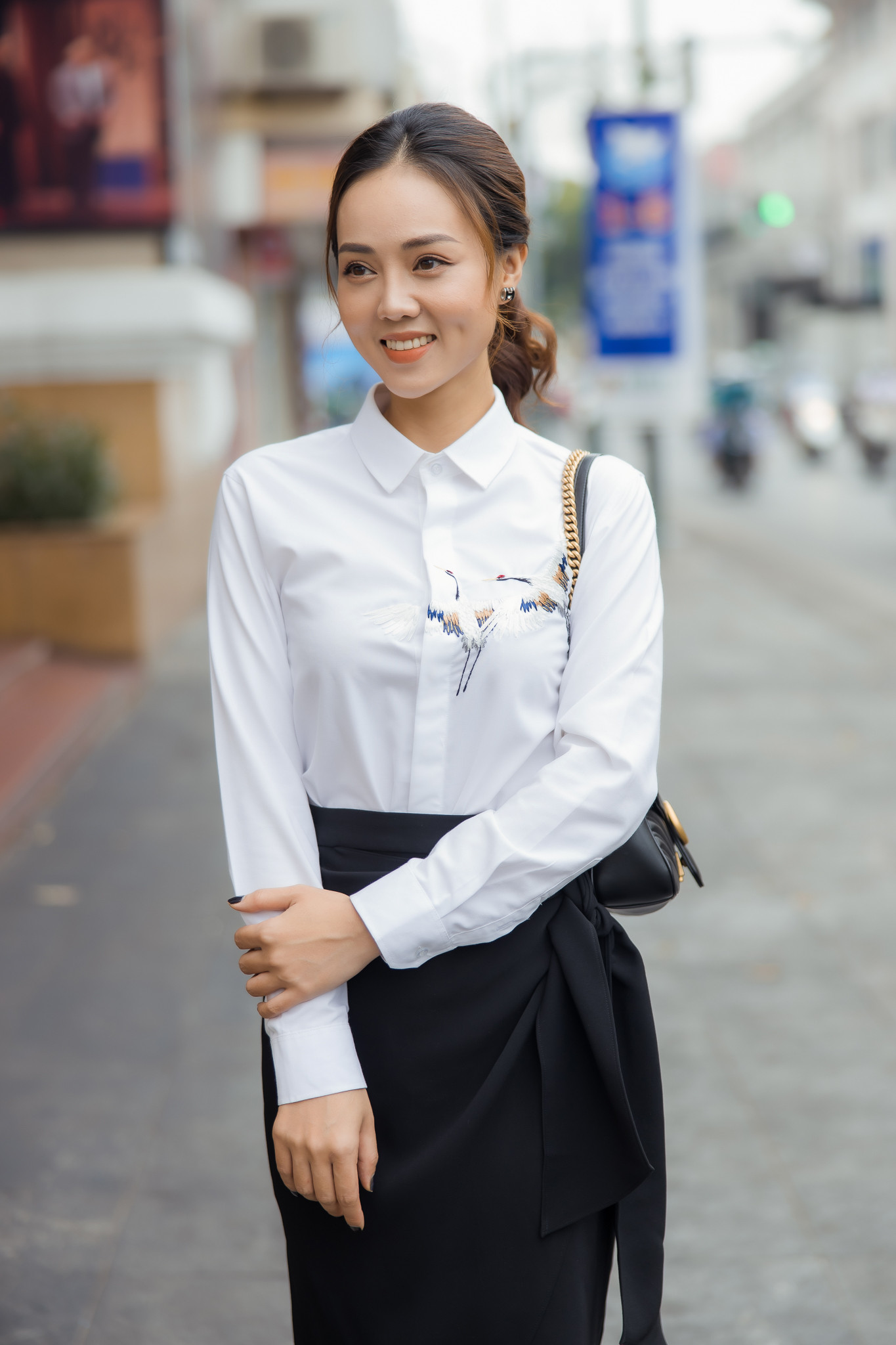 Người đẹp diện trang phục trắng-đen nền nã và thanh lịch.