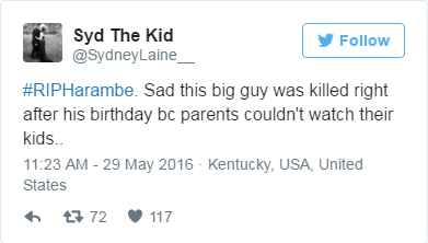 Tài khoản có tên Syd The Kid đăng lên mạng xã hội Twitter: “Thật đáng buồn. Chàng trai to lớn bị giết chết ngay sau sinh nhật chỉ vì cha mẹ không trông chừng được con của họ”.