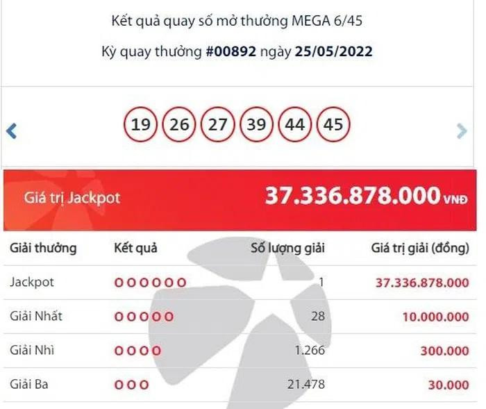 Kết quả xổ số Vietlott tối 25/5 cho thấy, tại kỳ quay số mở thưởng thứ 892 loại hình xổ số Mega 6/45, Công ty Xổ số điện toán Việt Nam (Vietlott) đã tìm được duy nhất chiếc vé trúng Jackpot trị giá 37.336.878.000 đồng. Dãy số trúng Jackpot là 19 - 26 - 27 - 39 - 44 - 45. Người chơi trúng Jackpot hơn 37 tỷ đồng này đã trở thành tỷ phú Vietlott thứ ba của tháng 5 này. Hệ thống Vietlott xác định tấm vé được in và bán ra tại một điểm bán ở TP.HCM. Trước đó, Vietlott đã tìm được tới hai người chơi may mắn cùng trúng Jackpot 2 trị giá hơn 4,6 tỷ đồng vào tối 14/5.