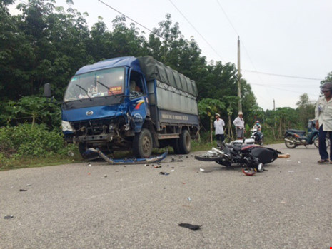 Hiện trường vụ tai nạn. Thời điểm trên, xe tải mang BKS: 90C-044.82 lưu thông trên tuyến đường liên xã, khi di chuyển đến đoạn đường cong thì xảy ra va chạm trực diện với hai thanh niên điều khiển xe máy mang BKS: 29Y3-341.90 lưu thông theo chiều ngược lại. Sau cú tông trực diện cả hai thanh niên cùng xe máy bị hất văng ra đường. Một thanh niên đã tử vong ngay tại chỗ, nạn nhân còn lại bị thương nặng được người dân đưa đi cấp cứu. (Xem chi tiết)