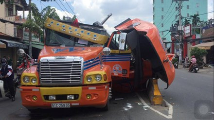 Xe container 'bẹp đầu' vì phanh gấp. Vụ tai nạn xảy ra vào khoảng 11h trưa nay (3/6), trên địa bàn phường Tân Phú, quận 7, TPHCM.