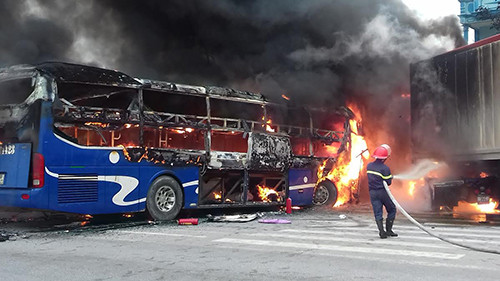 Cú đâm mạnh khiến ôtô khách phát hỏa. Người dân dùng phương tiện tại chỗ dập lửa nhưng bất thành. Chỉ trong ít phút, ngọn lửa bao trùm xe, lan sang phần đầu xe container. Thời điểm xảy ra tai nạn, trên xe khách có khoảng 30 người, rất may đều kịp phá cửa kính thoát ra ngoài. Tài xế xe container và một số hành khách bị thương đã được đưa đi cấp cứu. (Xem chi tiết)
