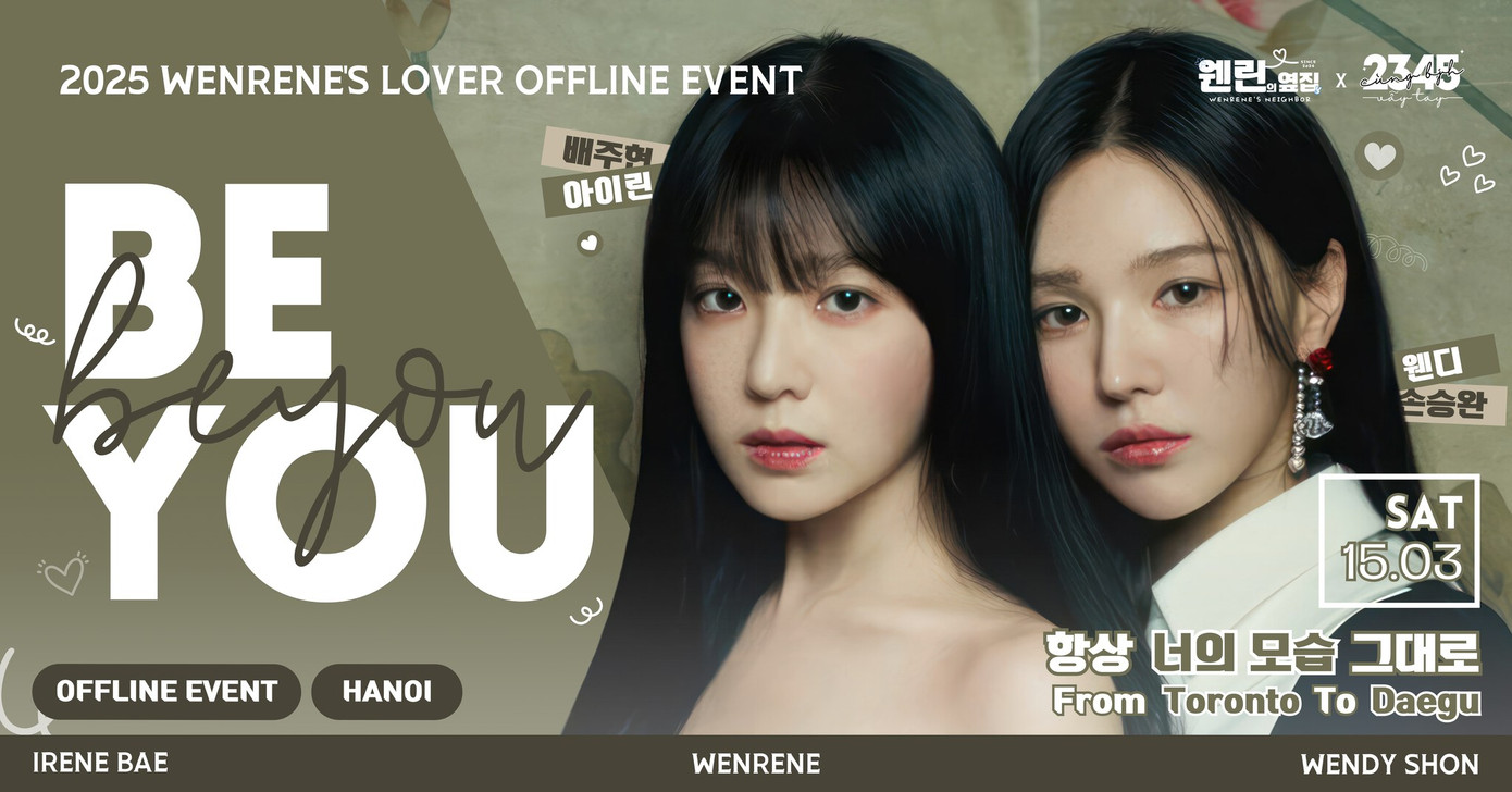 Trong tháng 3 này, Wenrene’s Neighbor và 2,3,4,5 cùng BJH vẫy tay cùng “bắt tay” tổ chức một buổi offline nhỏ mang tên Be You là dịp để fan của Irene và Wendy có dịp gặp gỡ, và lưu lại những khoảnh khắc đáng nhớ.