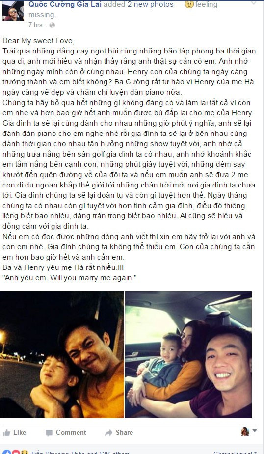 "Nếu em có đọc được những dòng anh viết, thì xin em hãy trở lại với anh và con em nhé. Gia đình chúng ta không thể thiếu em. Con của chúng ta cần em hơn bao giờ hết và anh cần em. Ba và Henry yêu mẹ Hà rất nhiều. Anh yêu em. Will you marry me again" - trích nội dung chia sẻ từ trang "Quốc Cường Gia Lai".