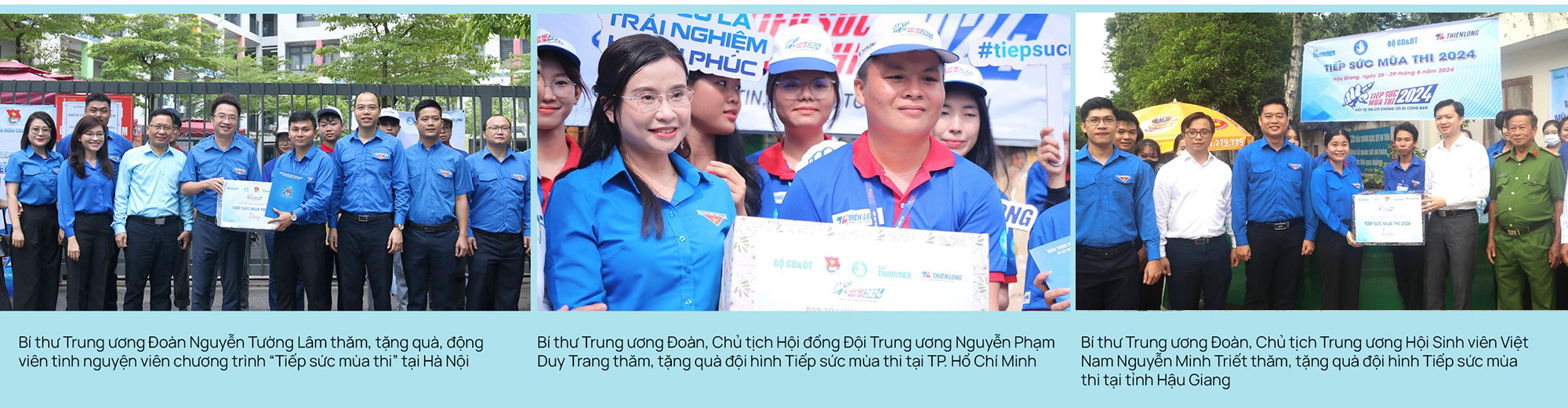 TP. Hồ Chí Minh: Ngày 27/6, đồng chí Nguyễn Phạm Duy Trang - Bí thư Trung ương Đoàn, Chủ tịch Hội đồng Đội Trung ương đã đến các cụm thi tại TP. HCM để thăm hỏi, động viên thanh niên tình nguyện viên tham gia Chương trình Tiếp sức mùa thi 2024. Năm nay, toàn Thành phố có 162 điểm thi. Các đội hình sinh viên tình nguyện tiếp sức mùa thi đang triển khai nhiều nội dung hoạt động tư vấn, hướng dẫn thí sinh và phụ huynh về phòng thi, phối hợp với lực lượng chức năng địa phương hỗ trợ, hướng dẫn phụ huynh dừng đỗ xe đúng quy định, phối hợp cảnh sát giao thông phân luồng giao thông tại điểm thi… Các đội hình cũng triển khai nội dung cổ vũ thí sinh bằng các sản phẩm do chính tay sinh viên tình nguyện thực hiện, phát tặng vật phẩm, nước uống, bút viết, văn phòng phẩm, sẵn sàng các phương án hỗ trợ khẩn cấp cho thí sinh gặp khó khăn.