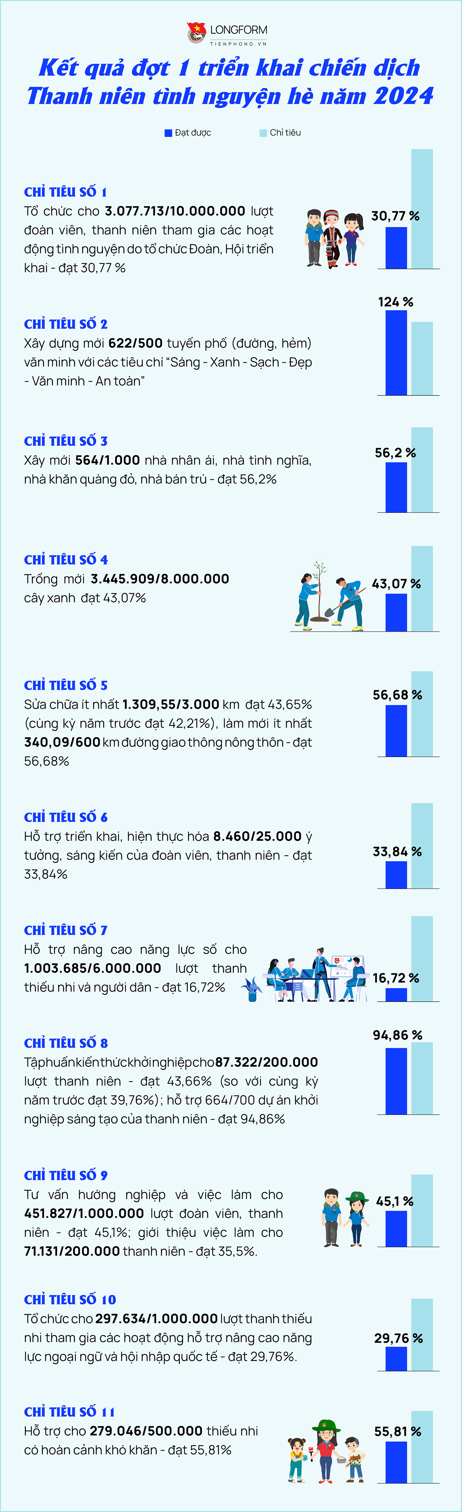 Trong đợt 1 của Chiến dịch Thanh niên tình nguyện hè 2024, trên cả nước đã thành lập đội hình tình nguyện, trên cả nước, các đơn vị đã thành lập 7.098 đội hình với 344.653 chiến sĩ tình nguyện.