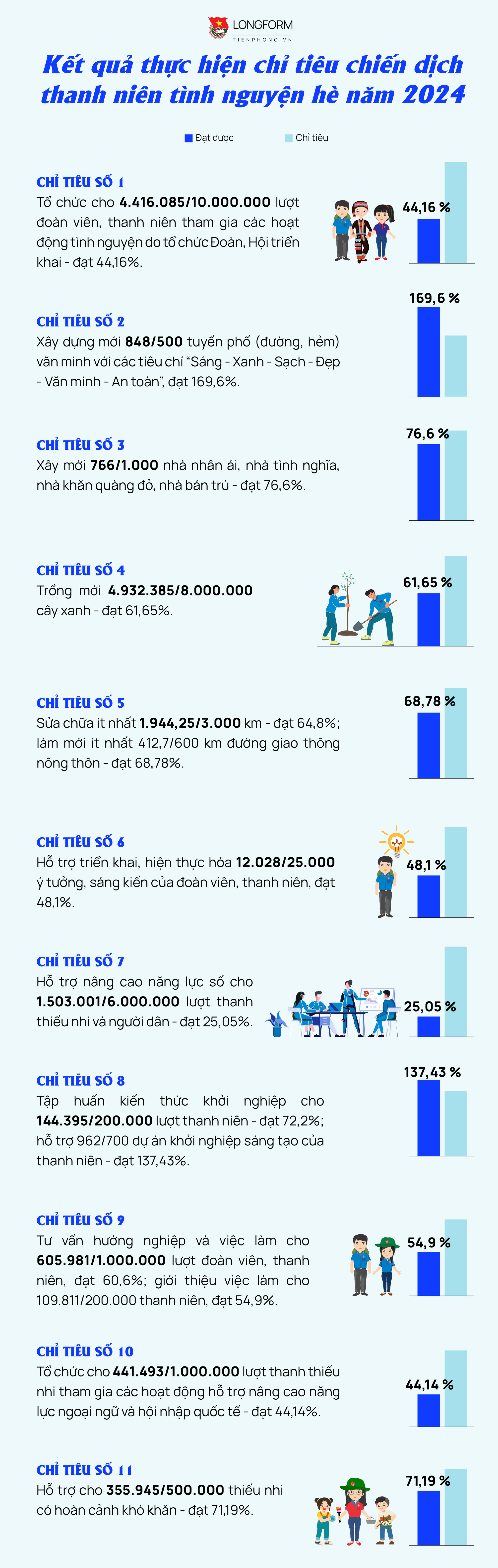 Tính đến ngày 14/7/2024, có tổng số trên cả nước có 557 trường Trung cấp, Cao đẳng, Đại học, Học viện triển khai với 2.324 đội hình và 156.846 tình nguyện viên tham gia
